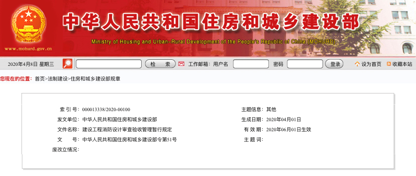 4月4日,住房和城鄉(xiāng)建設部網站發(fā)布《建設工程消防設計審查驗收管理暫行規(guī)定》(住建部令51號),《規(guī)定》適用于特殊建設工程的消防設計審查、消防驗收,以及其他建設工程的消防驗收備案、抽查,自2020年6月1日起施行。